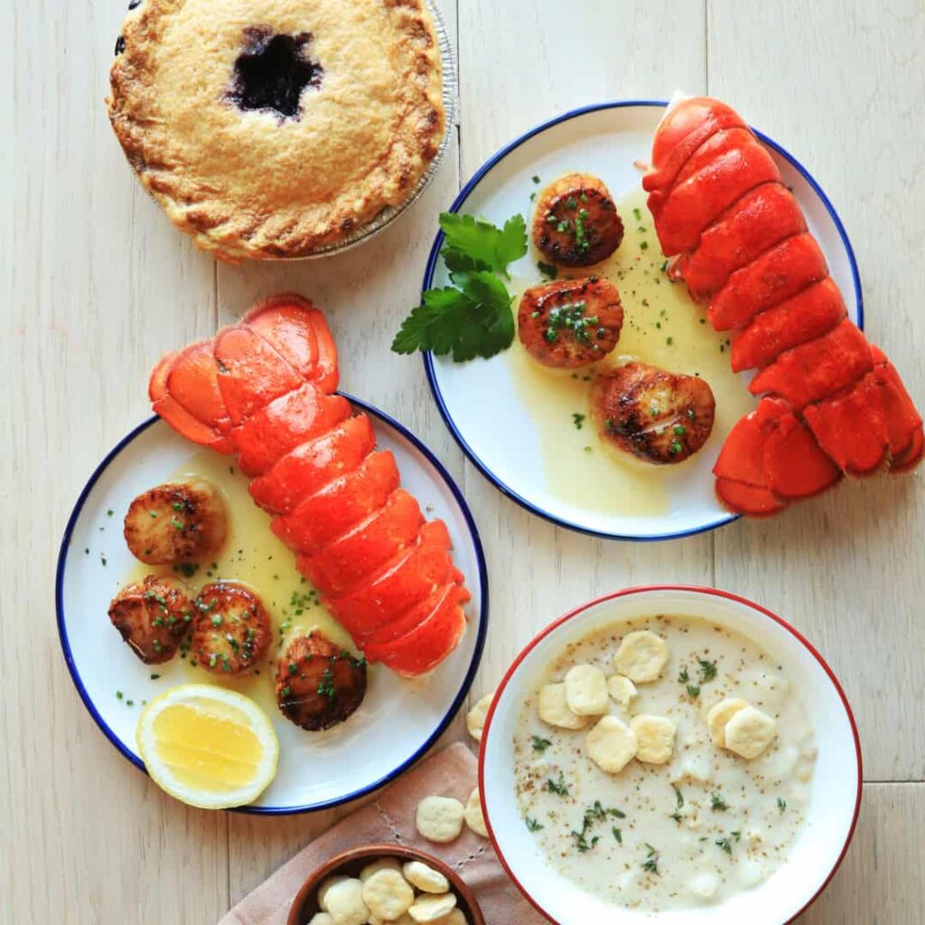 Authentic New England Christmas feast includes: (2) 6-7 oz Maine lobster tails, 1 lb local sea scallops, award-winning New England clam chowder (serves 2), and wild Maine blueberry pie. Complete Down East experience in one package.
